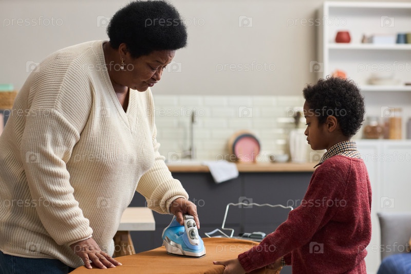 Чернокожая женщина среднего возраста учит молодого черного мальчика гладить на кухне
