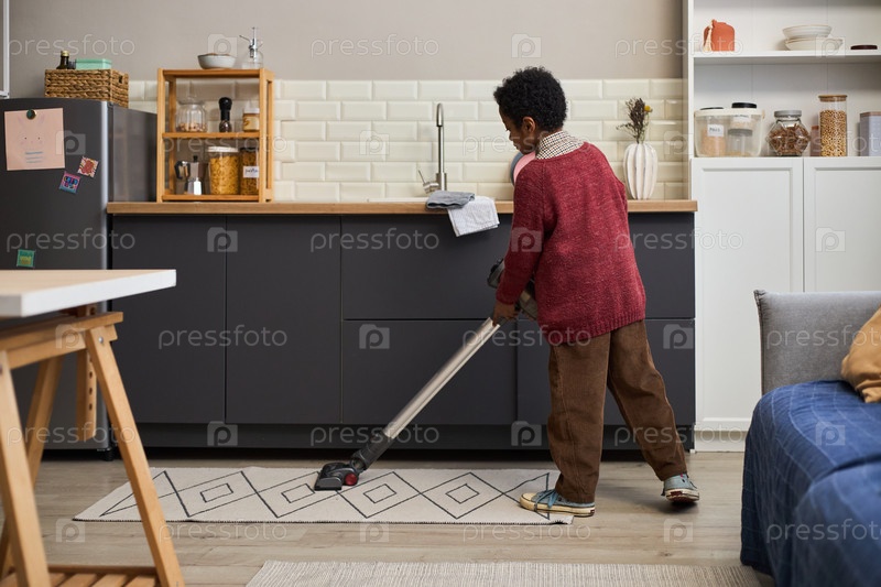 Молодой чернокожий мальчик пылесосит ковер на современной кухне дома