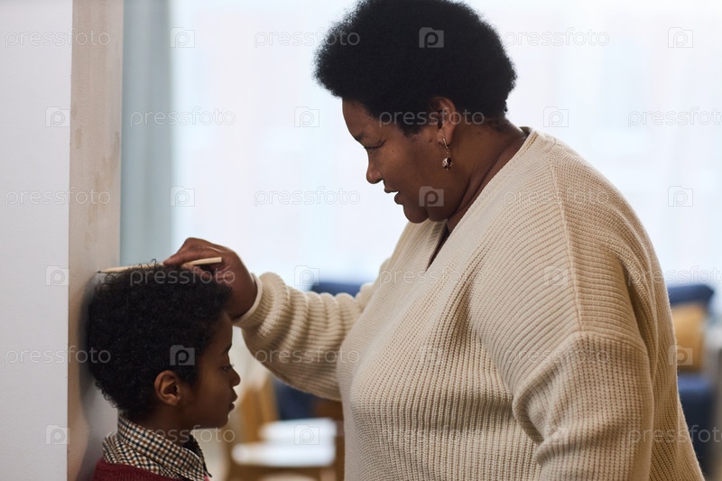 Чернокожая женщина среднего возраста измеряет рост молодого черного мальчика в помещении
