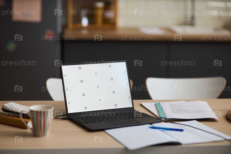 Открытый ноутбук на столе, отображающий пустой экран с документами и чашечкой кофе