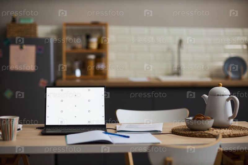 Современный кухонный стол с ноутбуком и открытыми книгами для дистанционного обучения