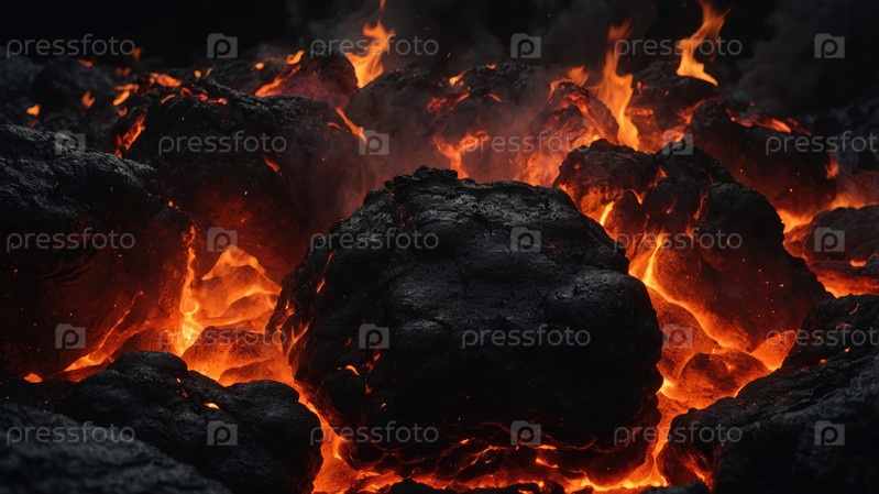Близкий взгляд на расплавленную лаву, протекающую между черными породами