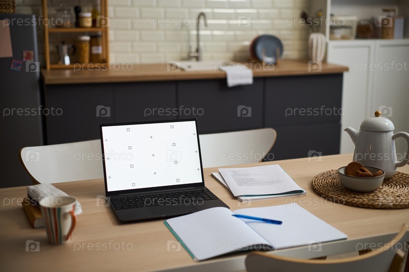 Современный кухонный стол с ноутбуком и блокнотами для удаленной работы