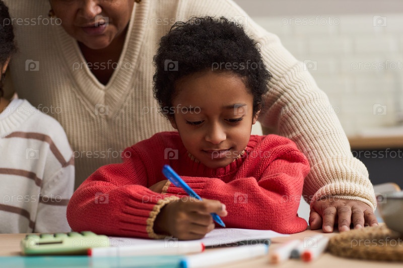 Молодой чернокожий мальчик пишет домашнее задание с помощью чёрной женщины среднего возраста