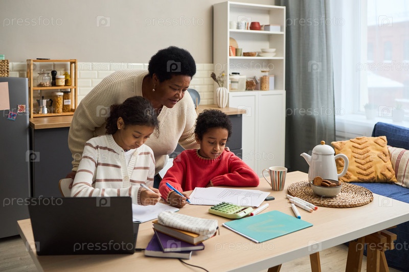 Чернокожая женщина средних лет помогает двум детям учиться вместе в помещении