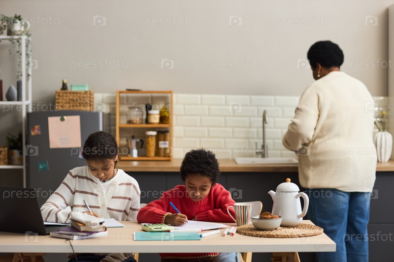 Черная женщина готовит еду, в то время как двое детей учатся за кухонным столом
