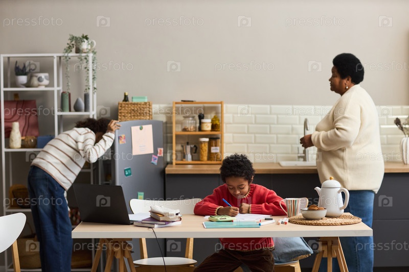 Молодой чернокожий мальчик выполняет домашнее задание, в то время как женщина среднего возраста готовит пищу поблизости