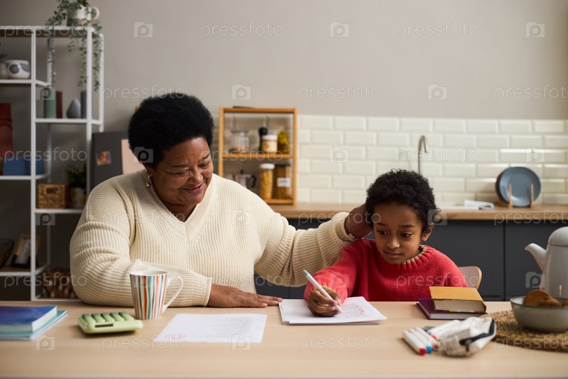 Чернокожая женщина среднего возраста помогает молодому черному мальчику учиться за кухонным столом