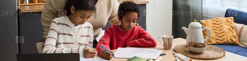 Чернокожая женщина среднего возраста помогает двум черным детям, которые учатся за столом