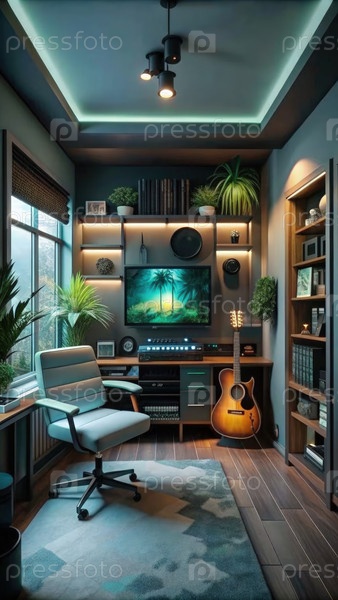 Современный домашний офис с голубыми стенами и уютным ковром