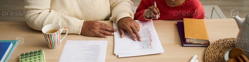 Старшая чернокожая женщина помогает молодой девушке учиться за столом в помещении