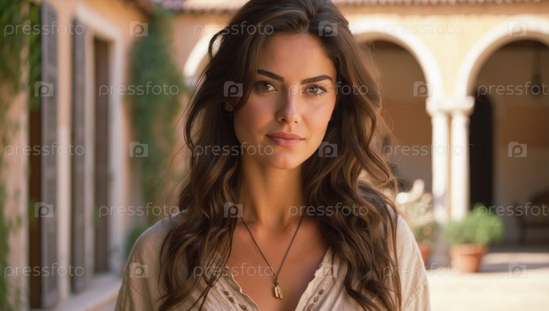 Молодая испанская женщина стоит во дворе с арочными проходами