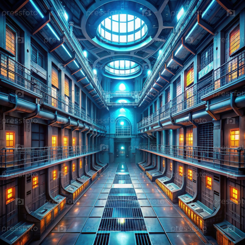 Футуристический тюремный интерьер с окнами и металлическими ячейками