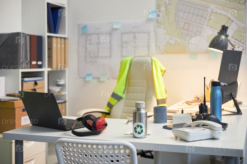 Офисный стол формена, отображающий оборудование безопасности и документы на строительство