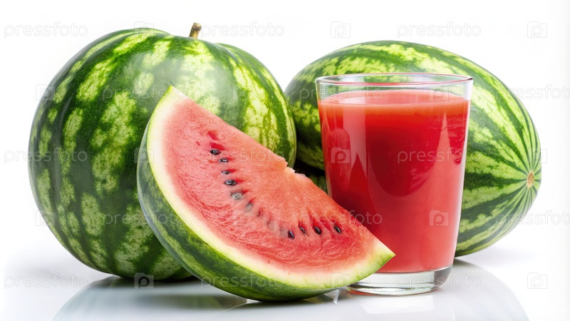 Свежие кусочки арбуза и стакан водного сока на белом фоне