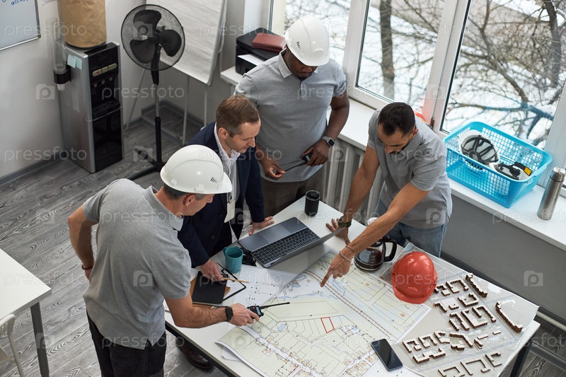 Мультиэтнический начальник среднего возраста и кавказский менеджер обсуждают планы строительства