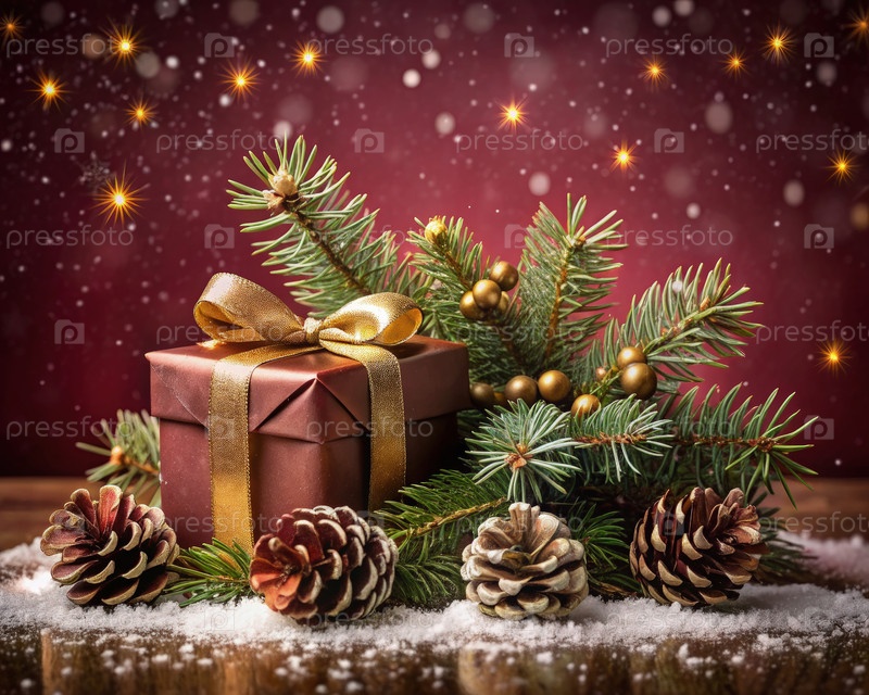 Подарочная коробка в упаковке с сосновыми ветвями и снегом для празднования Нового года