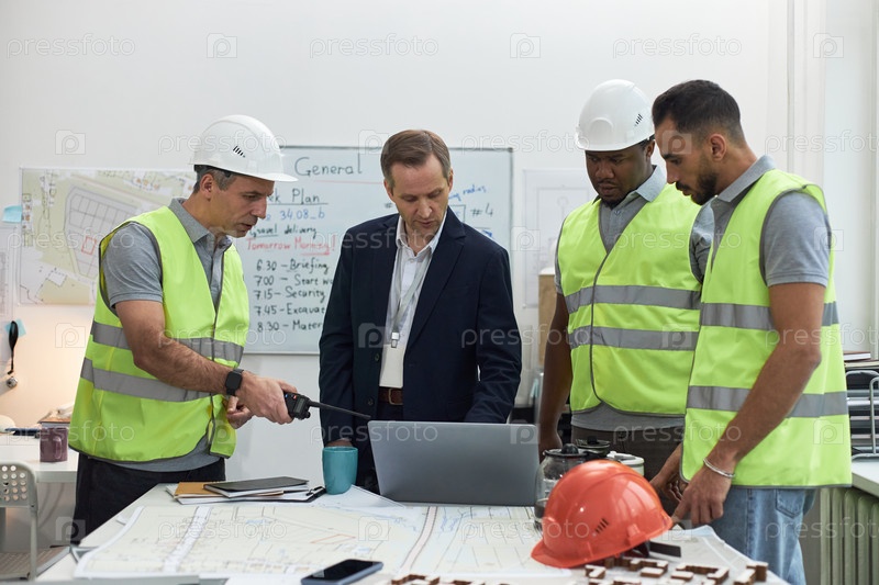 Кавказский рабочий среднего возраста, возглавляющий многонациональную команду и обсуждающий планы проектов