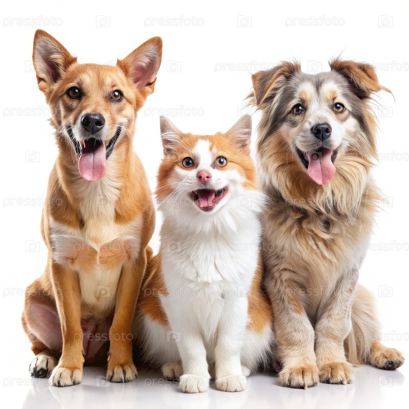 Счастливые домашние животные, сидящие вместе на белом фоне