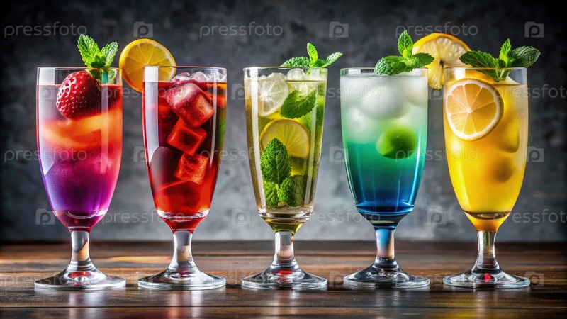 Цветные коктейли, украшенные свежими фруктами и мятой на деревянном столе