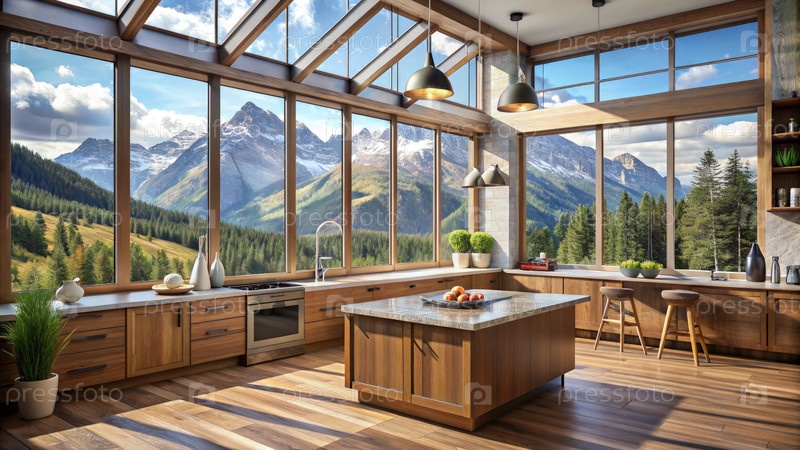 Кухня охотничьего домика с горным видом. генеративный современный ИИ