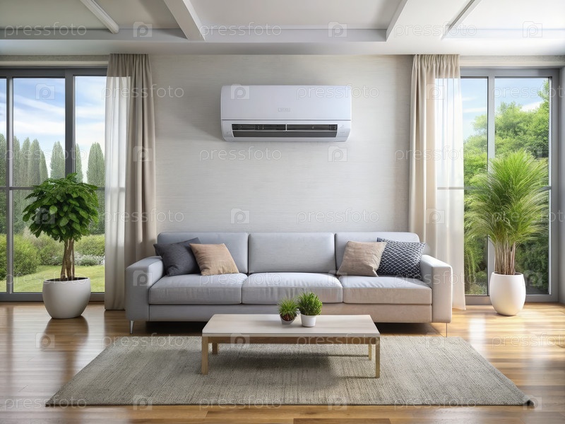 Жилая комната с кондиционером и пышной зеленью