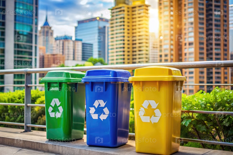 Городской пейзаж с тремя контейнерами для переработки в городских условиях