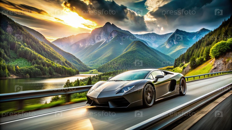 Черный спортивный автомобиль едет по горному ландшафту на закате