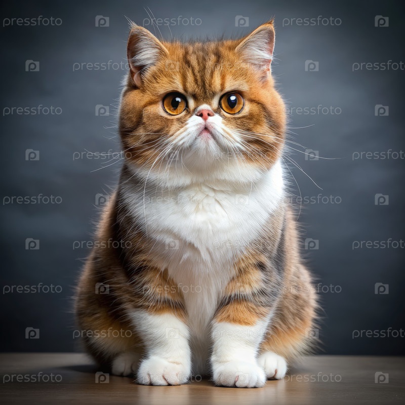 Экзотическая короткошерстная кошка сидит на деревянном столе на сером фоне