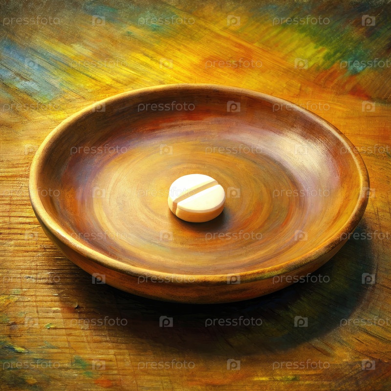 Одинокая белая таблетка, отдыхающая в деревянной тарелке на рустическом столе