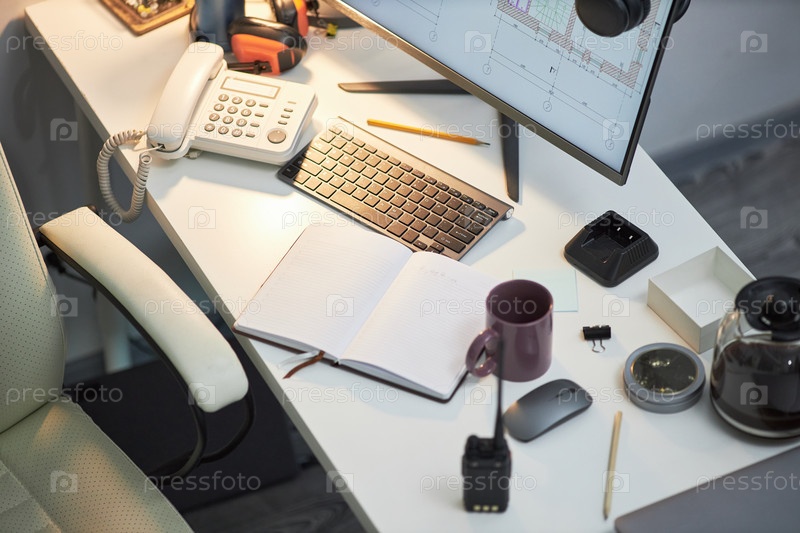 Стол офиса формена с коммуникационными устройствами и архитектурными планами
