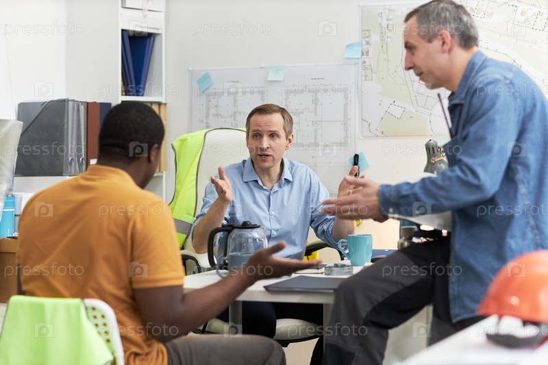 Кавказский бригадир среднего возраста ведет дискуссию с различными коллегами в офисе