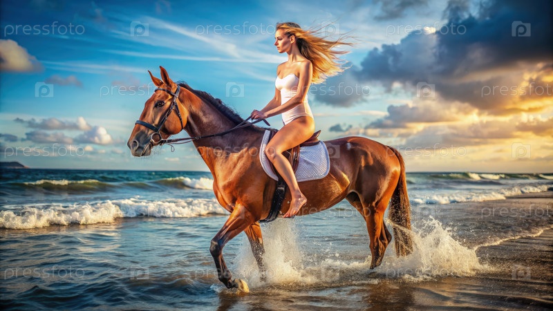 Женщина в купальниках верхом на лошади на пляже при закате солнца