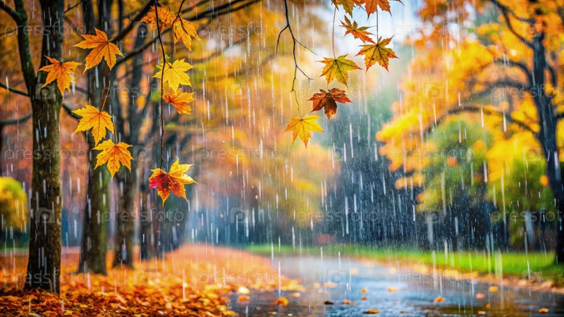 Осенний дождь стекает по золотым листьям в парке