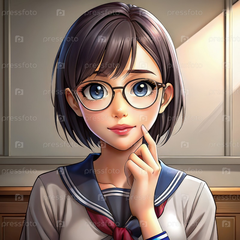 Девушка с короткими черными волосами, которая носит очки и униформу моряка