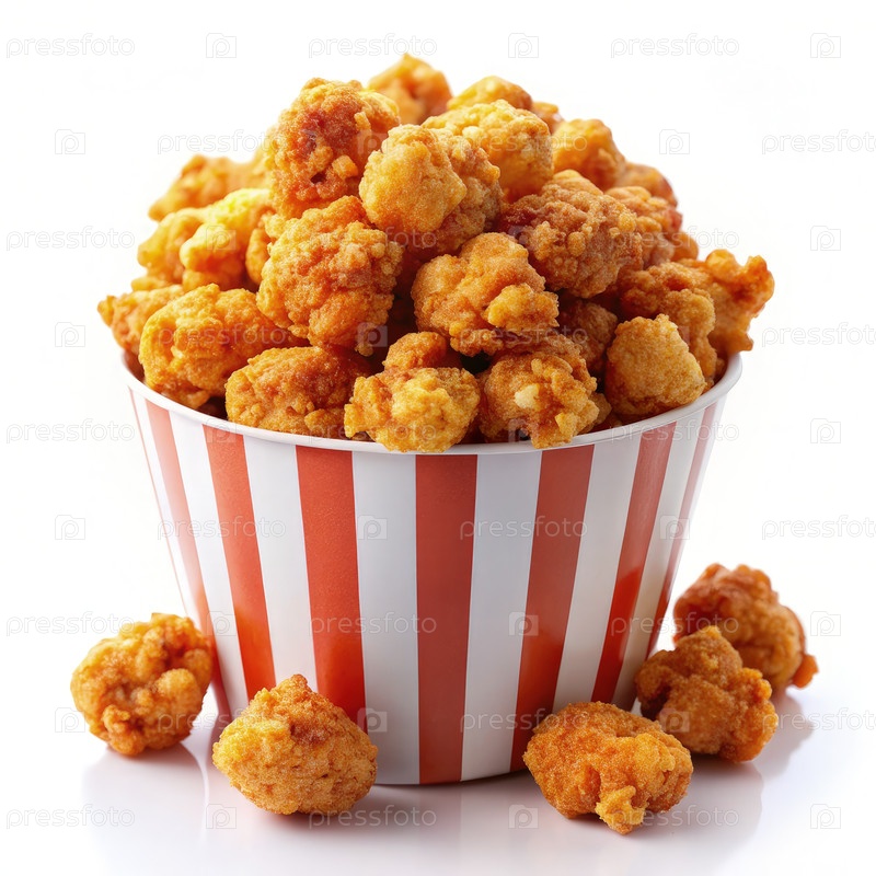 Хрустящие куриные попкорны в полосатой ведро на белом фоне