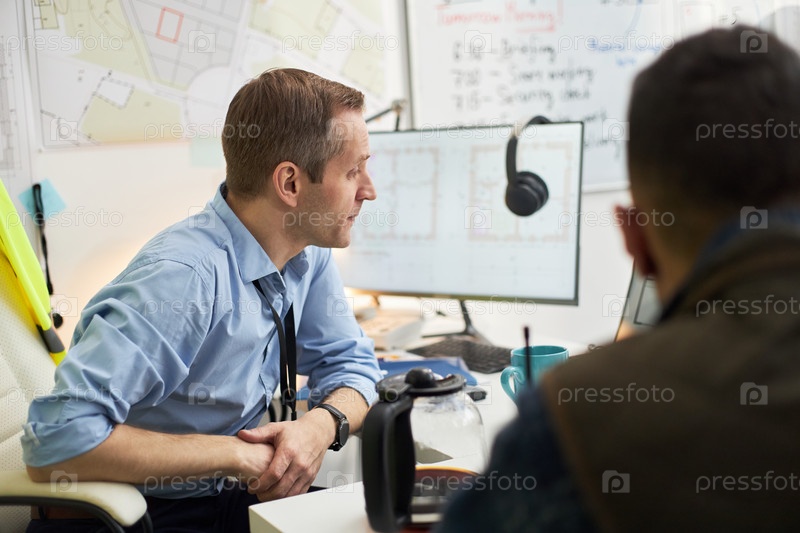 Кавказский бригадир среднего возраста, курирующий планирование проектов в офисной среде