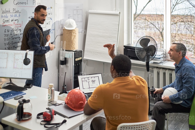 Мультиэтнические руководители средних лет обсуждают строительный проект в офисе