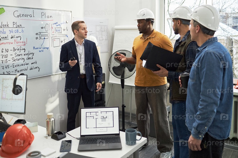 Кавказский мужчина среднего возраста ведущий мультиэтнический прораб обсуждает строительный план