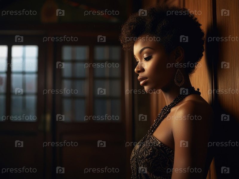 Женщина с афро-костюмом опирается на деревянную дверь