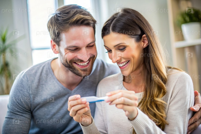 Счастливая пара получает положительные результаты теста на беременность дома
