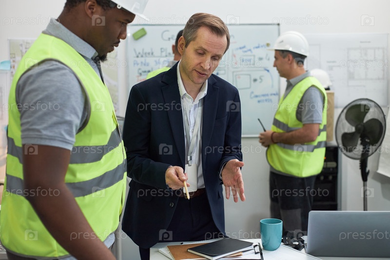 Кавказский форман среднего возраста обсуждает проект с молодым черным форманом