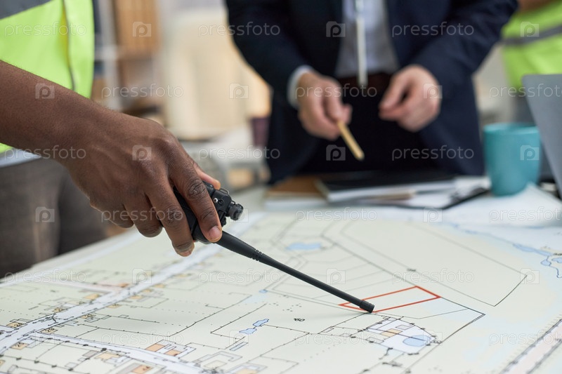 Чернокожий мужчина средних лет контролирует планирование строительных проектов в офисе