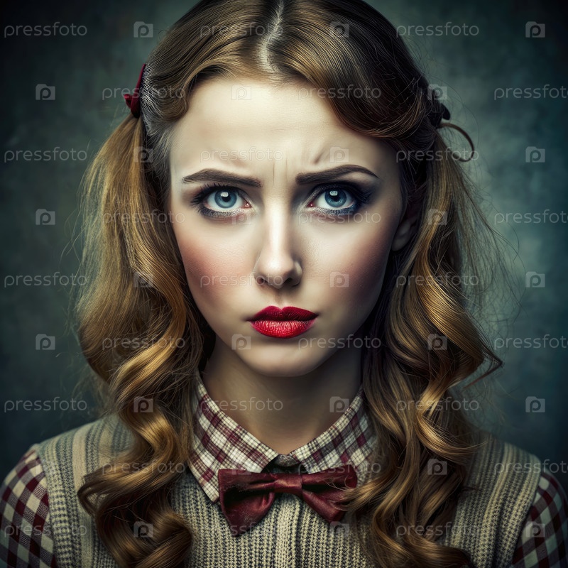 Молодая женщина с красным луком и бродячим выражением лица в портрете студии