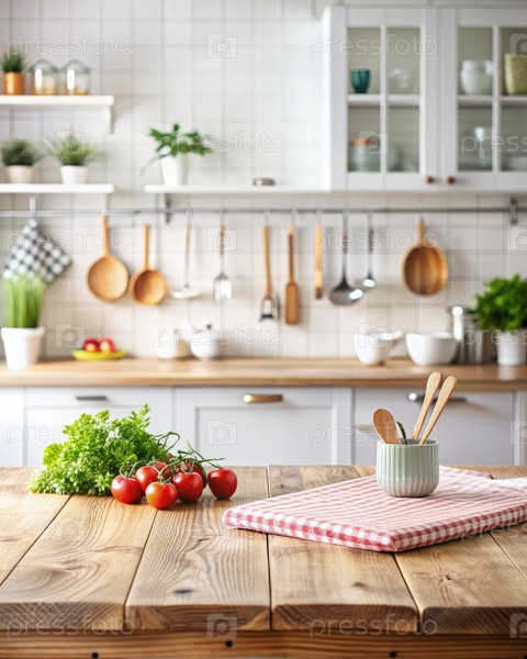 Деревянный кухонный стол с красным чемоданчиком и свежими помидорами
