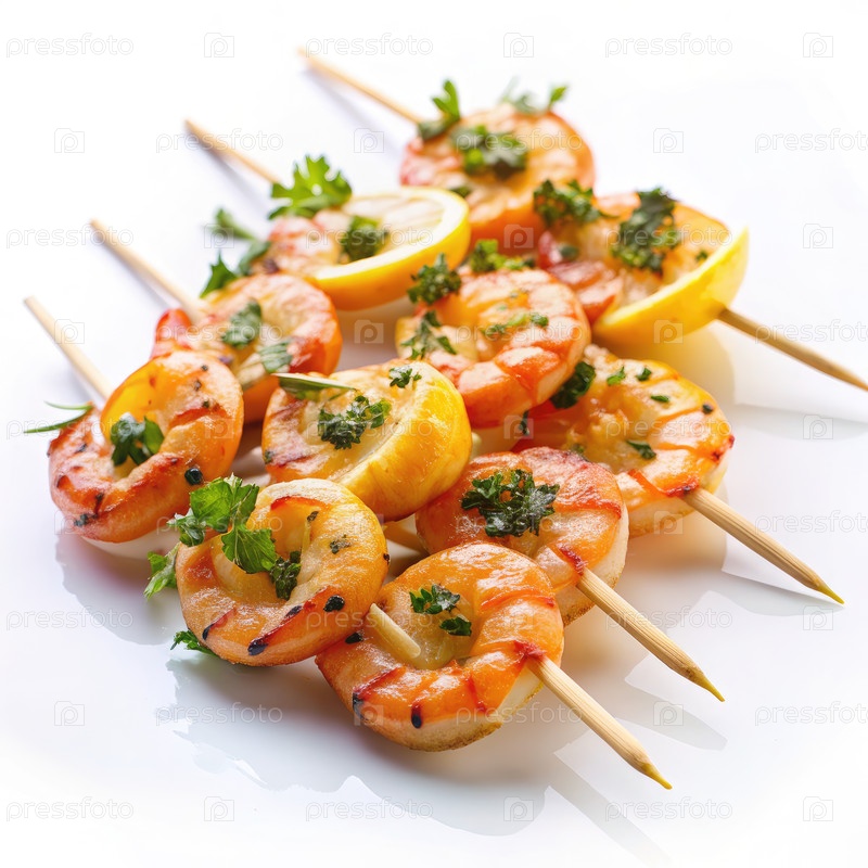 Гриллеры креветок с лимоном и петрушкой на белом фоне