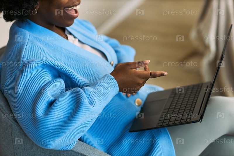 Молодая взрослая чернокожая женщина, использующая ноутбук для фемтех-консультации по здоровью онлайн