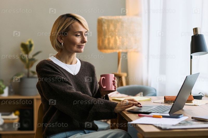 Белокожая зрелая женщина использует ноутбук и пьёт кофе в домашнем офисе