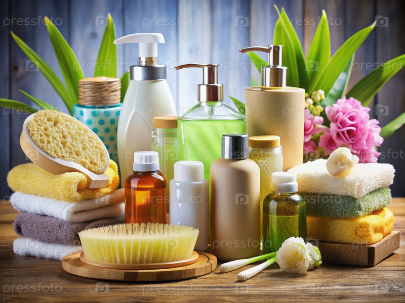 Продукты личной гигиены, вдохновленные спа-индустрией, отображаются на деревянном столе