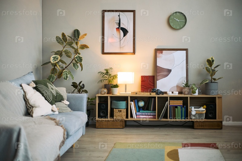 Интерьер гостиной с современными комнатными растениями и минималистическими элементами декора